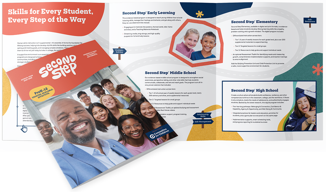 Second Step® programs empower preschoolers, teens, and all ages in between with human skills to build lifelong success. Choose from a cohesive family of research-based programs that work together to provide kids with important skills throughout their developmental stages, and in both classroom and out-of-school time settings. In addition, our professional development program for educators brings the benefits of these important human skills to your staff and school culture, so everyone can thrive.